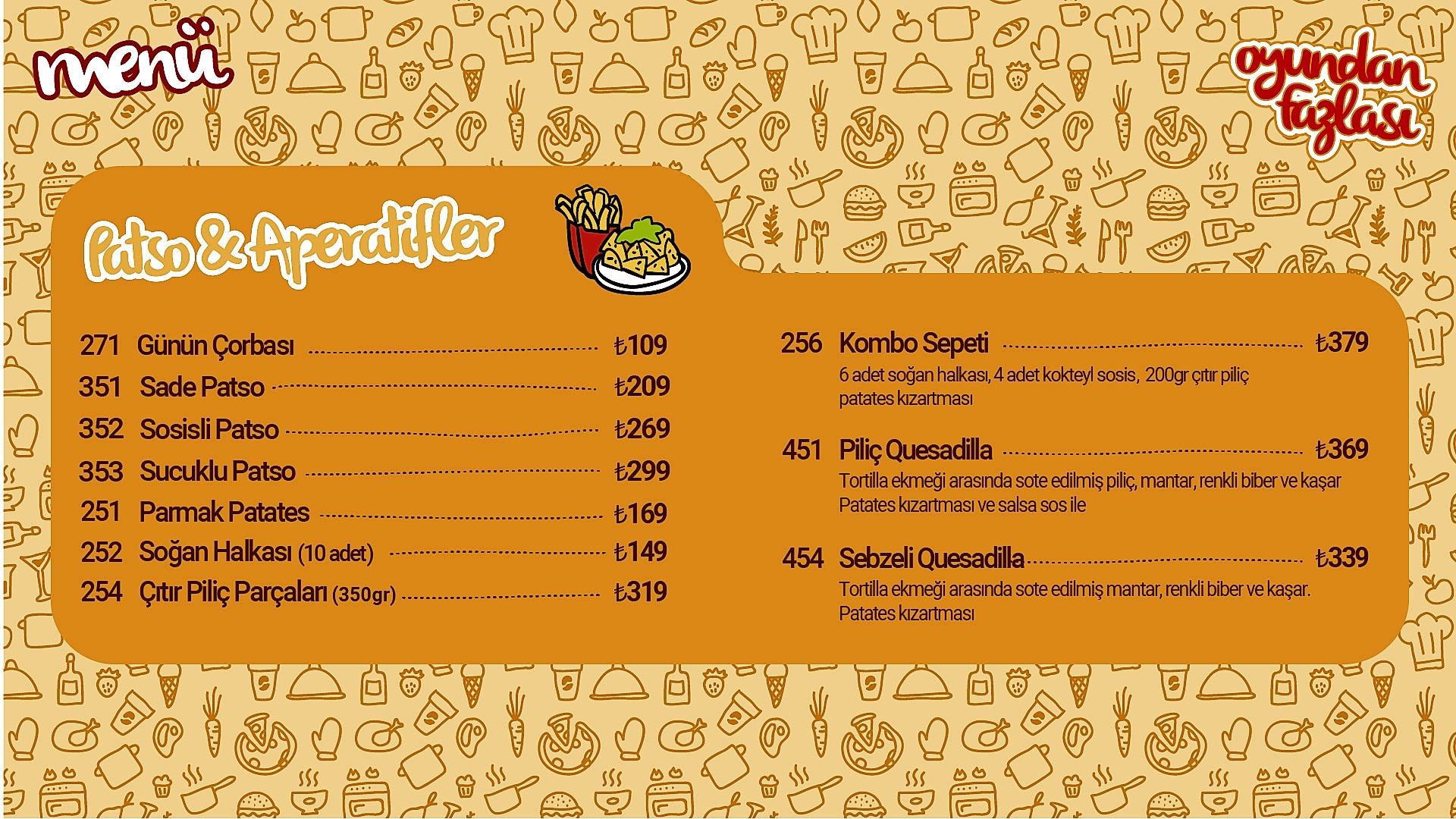 6 adet soğan halkası, 4 adet kokteyl sosis, 200gr çıtır piliç patates kızarması