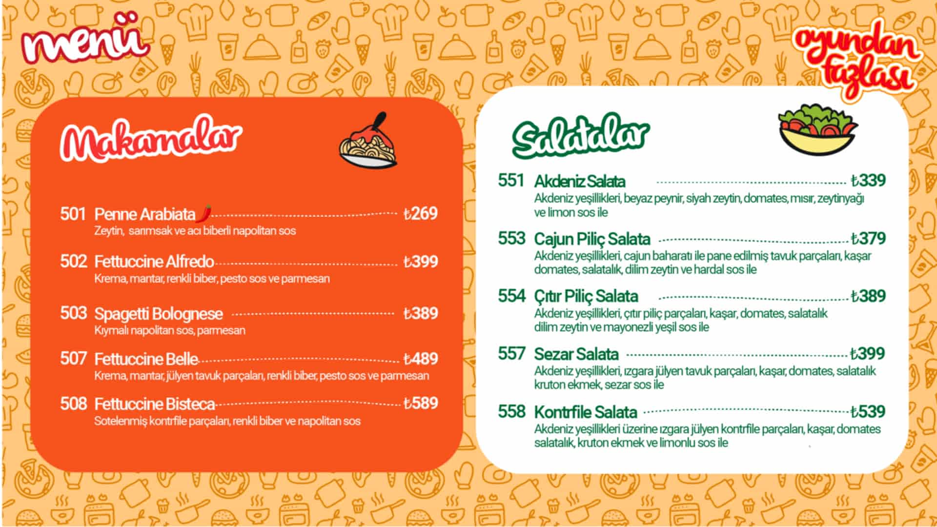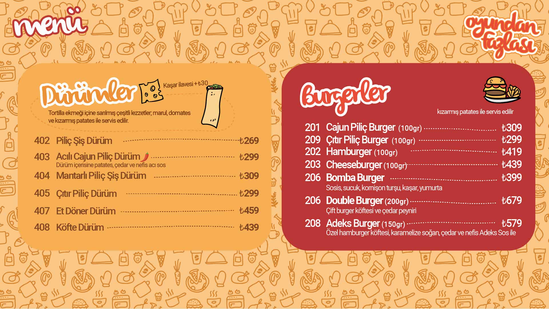 Kontrfile, soya sosu, soğan ve nefis Adeks Sos. Yoğurt, çedar patates kızartması ve salata ile tabakta servis edilir.